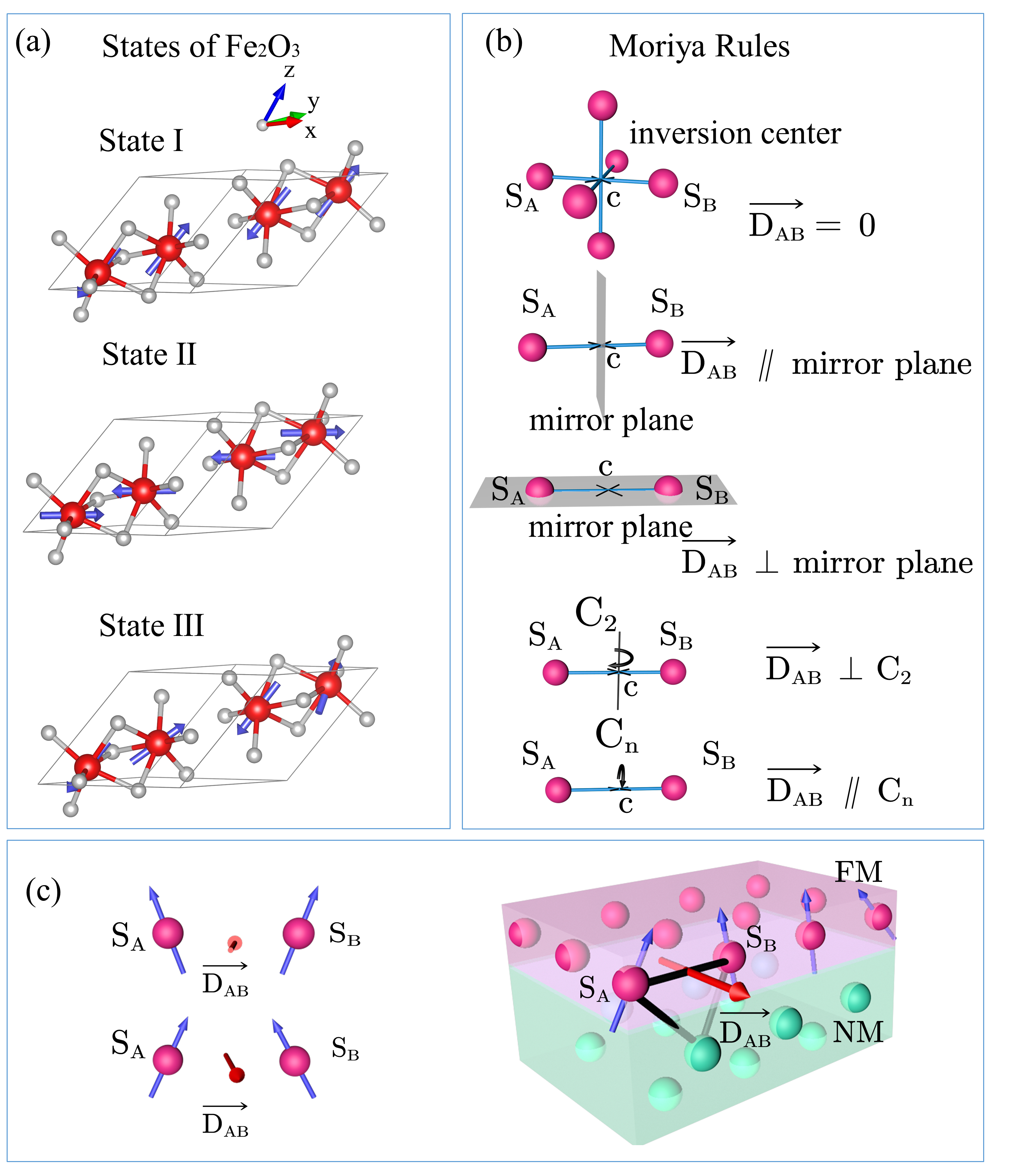 DMI,又称反对称交换耦合,最早为Igor Dzyaloshinskii所提出,用于解释图1 (a)中Fe2O3等反铁磁体中的弱净磁矩 [Sov. Phys. JETP 5, 1259 (1957); J. Phys. Chem. Solids 4, 241 (1958)]。T?ru Moriya从Anderson的超交换理论出发[P. W. Anderson, Phys. Rev. 115, 2 (1959)],完善了关于DMI的理论 [T. Moriya, Phys. Rev. Lett. 4, 228 (1960); T. Moriya, Phys. Rev. 120, 91 (1960)],提出了DMI矢量的简明判据——Moriya定则,如图1(b)所示。