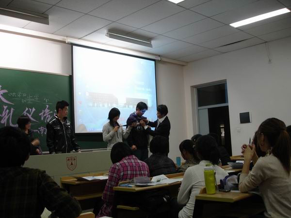 接着,朱先生还介绍了如何搭配西服,如何打领带,如何递交名片,如何介绍他人,如何握手等同学们感兴趣的话题。尤其在打领带这一环节,5名同学被邀请上台,跟着朱先生学习如何打领带,朱先生在现场手把手地教起了“学徒”。几名同学笨拙不熟练的手法引起台下笑声一片。