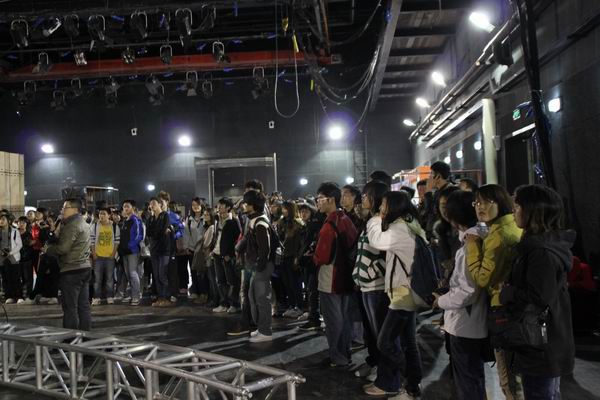 在工作人员的引导下,同学们来到了《非诚勿扰》的演播大厅。虽然大家并没有赶上节目录制,但从正在拆除的舞台上依然可以想象节目录制时的盛况。《非诚勿扰》节目组的工作人员向同学们详细地介绍了节目的一些情况,并耐心的回答了同学们提出的一些问题。
