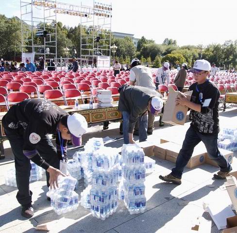 物资摆放完毕后,来不及吃晚饭,他们马上又投入到入场嘉宾和观众的引导工作中。现场一万多名嘉宾和观众,在他们有序地引导下,顺利地找到座位。两个多小时的开幕式及文艺演出结束后,他们又投入到观众的疏散工作以及现场物资的整理工作当中去。等一切结束后,已经到第二天凌晨。