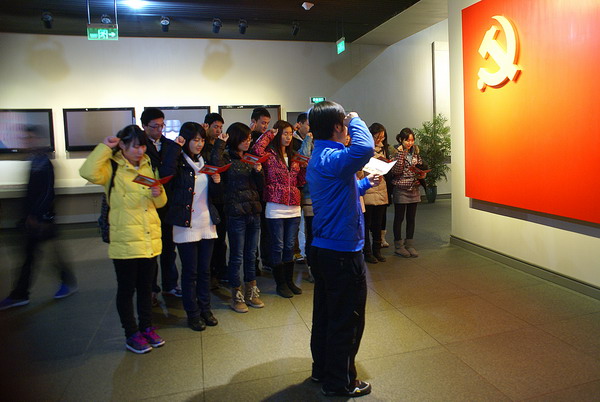 参观学习的第一站是南湖革命纪念馆。该馆是为纪念中国共产党第一次全国代表大会在浙江嘉兴南湖胜利闭幕这一重大历史事件而修建的。全体党员在潘益农老师的带领下,首先参观了馆内的基本陈列“中共一大史料陈列”,学习了1840年鸦片战争以来中国人民为寻求救国救民的道路而不断探索、抗争以及中国工人阶级的壮大、马克思主义在中国的传播、共产主义小组的建立直至中国共产党成立这一历史史实。其中,着重学习了中国共产党成立的历史过程。随后,全体党员参观了“中国共产党的七十年”、“党和国家领导人对南湖的关怀”两个辅助陈列室。最后,在纪念馆内的宣誓墙前,我院新入党的学生党员举行了庄严的宣誓仪式。