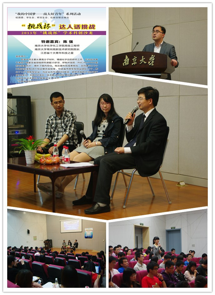 4月16日,由校团委、学生会、研究生会、社联会联合推出的“我的中国梦——凯发好青年”系列之“达人话挑战——2013年挑战杯学术科创沙龙”在仙林校区敬文学活动中心科技报告厅举办。凯发k8官网化学化工学院高级工程师、凯发k8官网常州高新技术研究院院长、江苏省十大青年科技之星陈强老师作为特邀嘉宾与学生分享了“挑战杯”经验并点评学生参赛作品。校团委书记葛俊杰、副书记蔡颖蔚等老师和本届挑战杯凯发赛的各支团队以及全校慕名前来的近百名同学参与了本次沙龙。