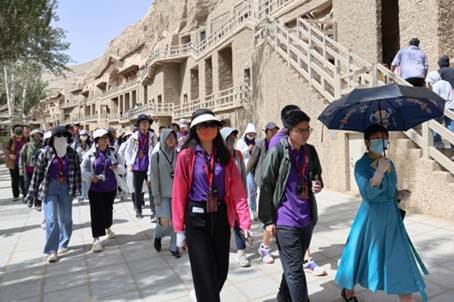 6月25日至30日的实地考察研学活动更是点燃了同学们对敦煌文化的热情。在鸣沙山,同学们深入感受了敦煌地区的气候、地貌和环境,意识到敦煌文化保护所面临的自然环境挑战。在阳关,研学团队在悠悠驼铃声中重走丝绸之路,进一步体悟古代丝路、边塞文化。借助莫高窟数字展示中心的专题电影和室内体验沉浸剧《乐动敦煌》,同学们亲身体验了中华优秀传统文化在当代的创造性转化、创新性发展。在敦煌博物馆,同学们漫步于历史与艺术的殿堂,感悟先人的孜孜创造与传承者的不懈守护。在莫高窟和西千佛洞,同学们于历经千年依旧色彩鲜亮的壁画中,真切触及盛世气象里的钗光鬓影;于精雕细琢的塑像身上,看见敦煌历久弥新的灵韵。同学们纷纷表示,此前从未如此真实地感受到壁画和雕塑的细节、色彩和质感,为千年文明震撼不已,为先民信仰的力量深深打动,更为一代又一代敦煌文化的保护者、研究者的坚持肃然起敬。