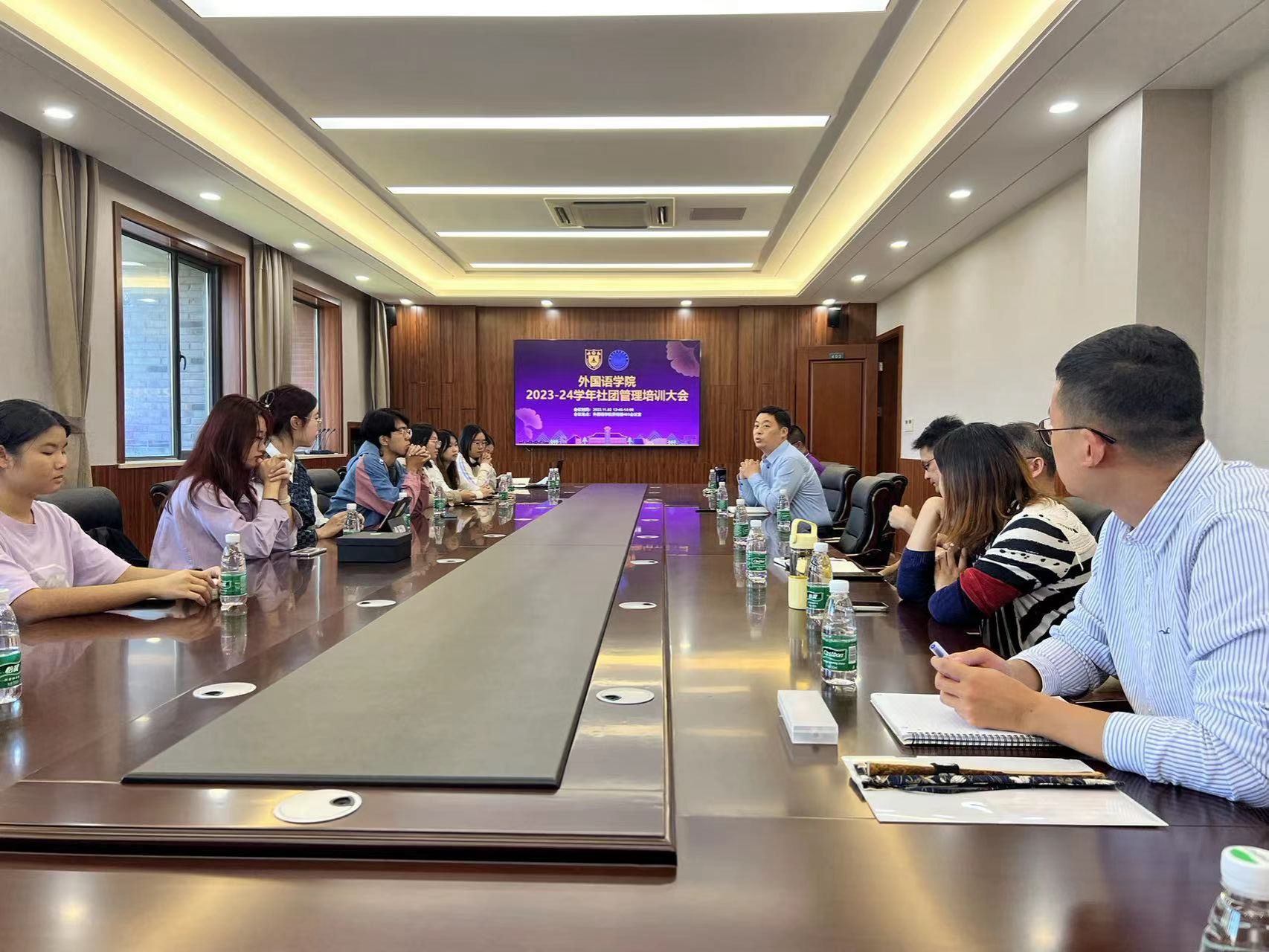 2023年11月2日中午,外国语学院于侨裕楼举行学生社团管理培训大会,传达学校党委和团委有关文件精神和工作要求,就社团管理进行政策和业务培训,并开展师生交流。社团指导老师法语系教学主任张晓明、日语系教学主任李斌、西语系教学主任裴枫、俄语系教学主任杨正、朝鲜语系教学主任吴玉梅、德语系常晅、英语系刘洋、大学外语部张洁、外院团委副书记龙心悦老师以及八个社团的负责同学出席会议。会议由外国语学院党委副书记孔剑锋主持。