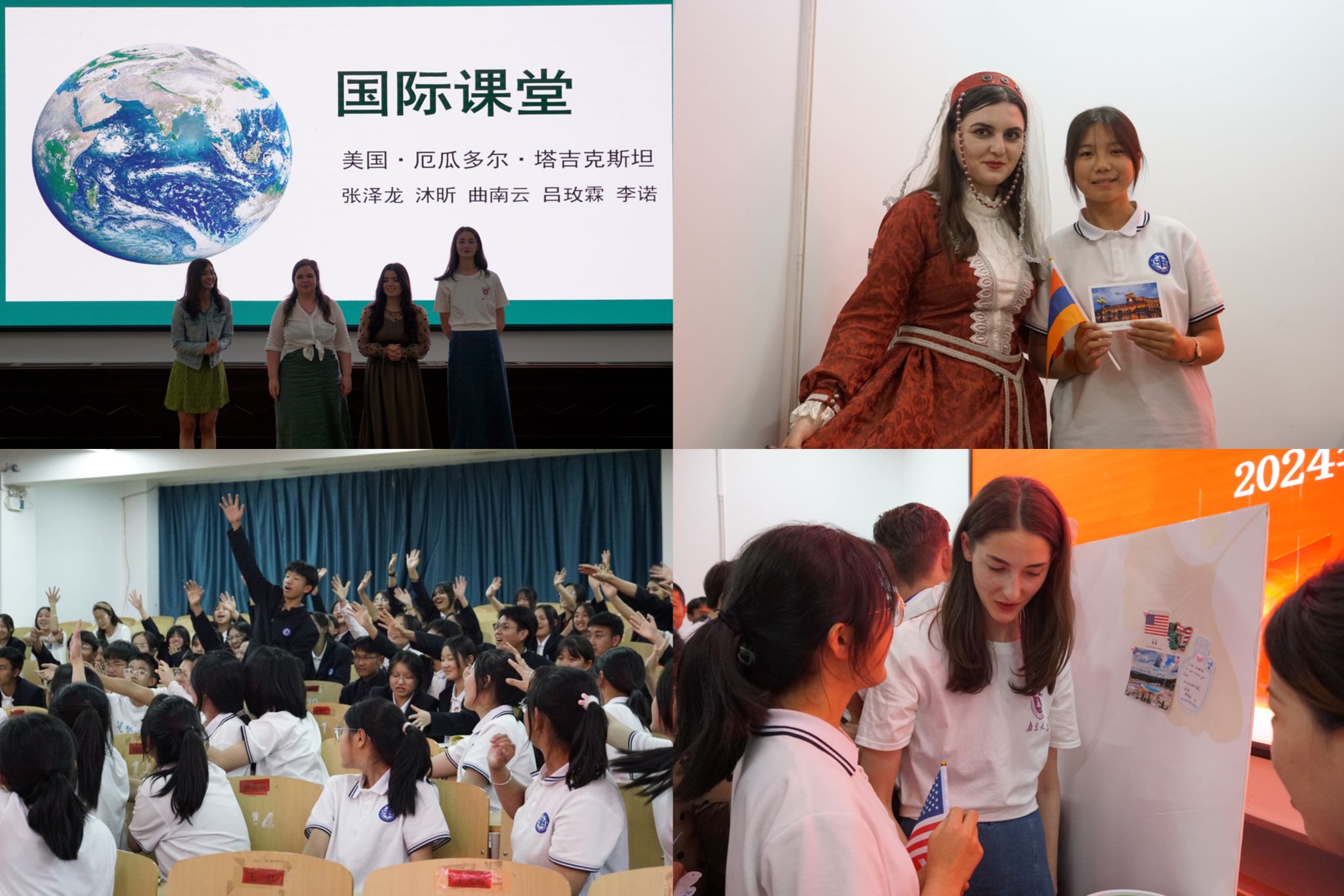此外,来自全球15个国家的留学生们还走进双柏一中教室课堂,他们不仅带来了展示不同国家文化特色的国际大课堂,还与双柏一中的同学们共同打造了一扇展现多元文化的友谊之窗。在国际大课堂讲台上,留学生们热情洋溢地介绍各自国家的历史文化、风土人情以及与中国与云南的交往故事,并讲授了一些基本的外语问候语,赢得阵阵欢呼和掌声。双柏一中的同学们在两个小时内跟随留学生的讲述开启了一段神奇的环球之旅。为了在双柏一中留下更丰富多彩的文化记忆,凯发k8官网海外教育学院利用自身国际化特色,打造了一面“多元文化 友谊之窗”展板。在揭幕仪式上,留学生们用“五个一”( 一面国旗、一张写有本国祝福语的卡片、一张本国风景照明信片、一个本国标志性建筑的冰箱贴和一张凯发留学生与双柏一中学生的合照)打造了一扇看世界的友谊之窗。凯发留学生邀请双柏一中的同学们一起粘贴卡片、印下手印,在双柏一中搭建起一座跨文化交流的桥梁,承载起中外学生间的深厚友谊。