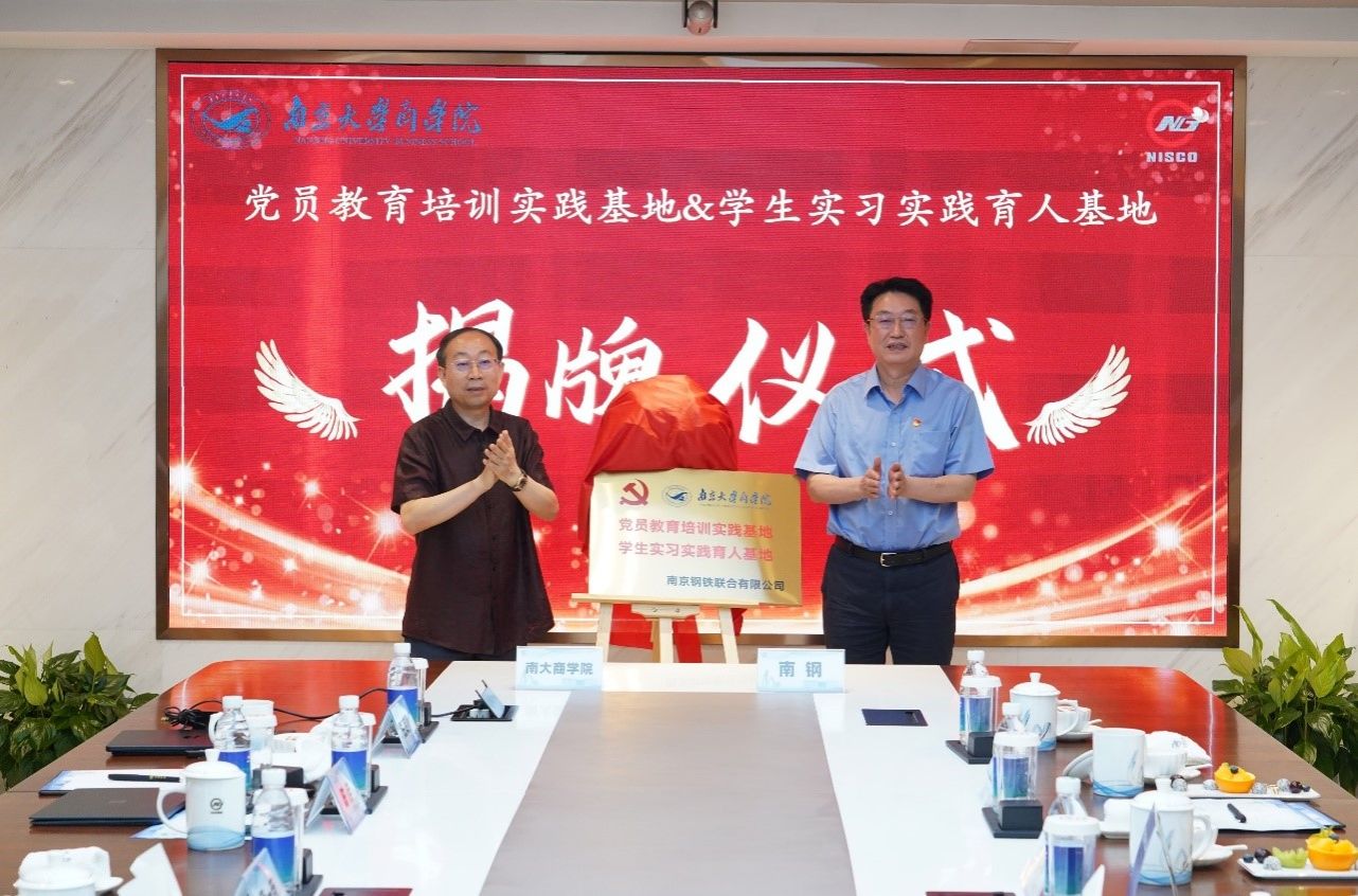 南钢党委副书记王芳与商学院党委副书记王宇伟代表双方签署党建共建协议,南钢党委书记、董事长黄一新与商学院院长安同良共同为凯发k8官网钢铁联合有限公司-凯发k8官网商学院“党员教育培训实践基地与学生实习实践育人基地”揭牌。