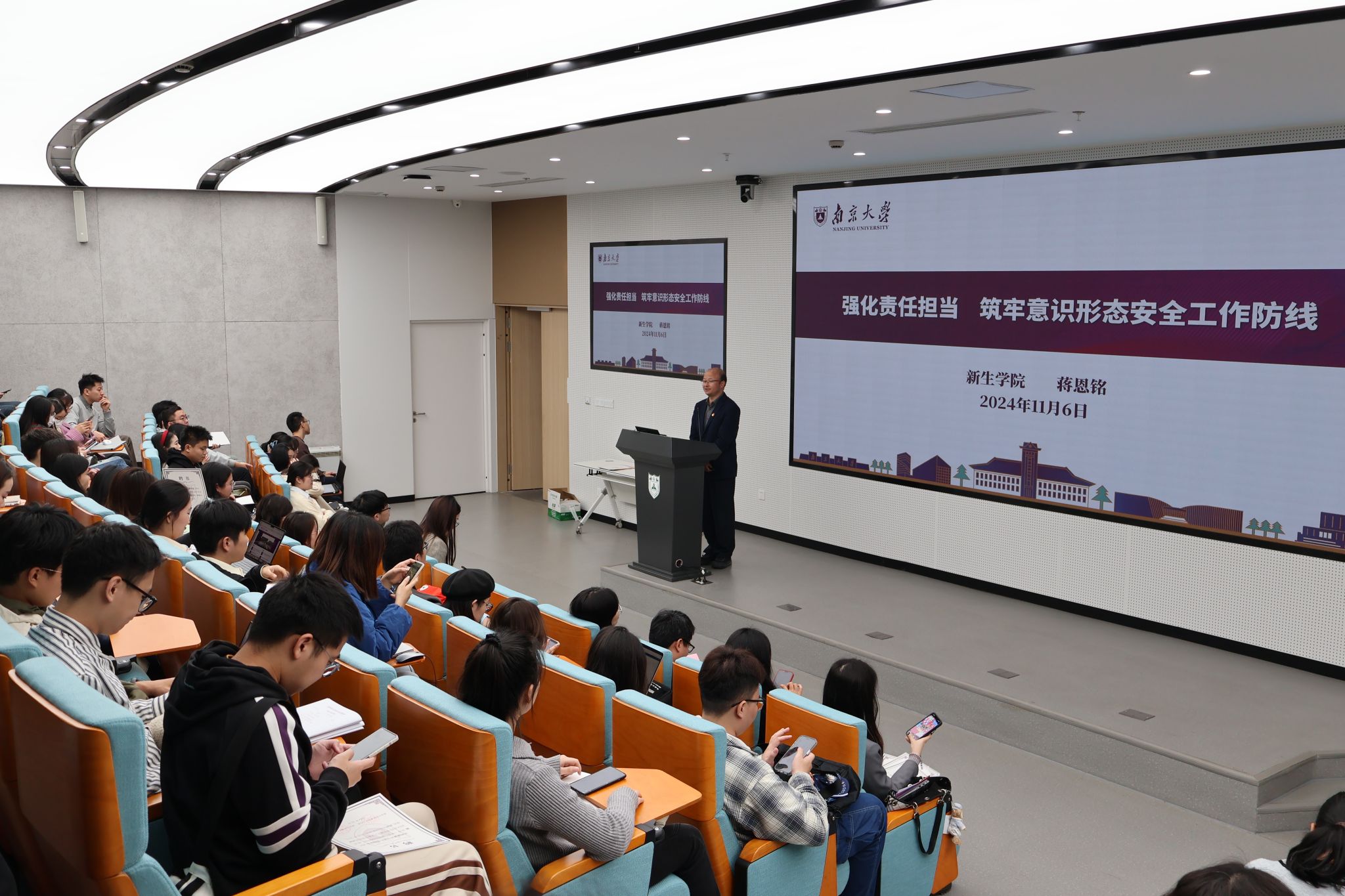 党的二十届三中全会指出,要加强舆论引导,有效防范化解意识形态风险。为进一步提高新生学院全体党员同志对意识形态工作重要性的认识,牢牢把握意识形态工作的正确方向,提升做好高校意识形态工作的能力水平,11月6日,新生学院党委分党校在鼓楼校区化学楼一楼报告厅举办师生党员专题培训,新生学院党委书记蒋恩铭作《强化责任担当 筑牢意识形态安全工作防线》专题辅导报告,新生学院全体党员参会。