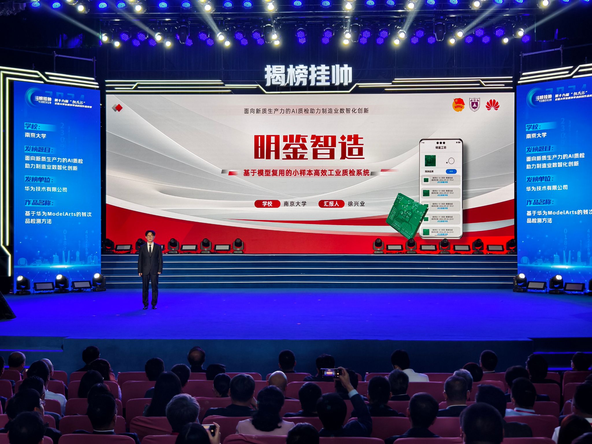 经过激烈角逐,我校团队在此次“揭榜挂帅”专项赛中斩获特等奖6项、一等奖5项、二等奖3项、三等奖3项,在本届中国大学生创业计划竞赛中斩获2项金奖、1项银奖、4项铜奖。其中,来自人工智能学院的项目《基于华为ModelArts的残次品检测方法》表现突出,在“揭榜挂帅”专项赛中获得“擂主”,学生负责人徐兴业同学作为擂主代表在颁奖仪式暨“青春筑梦·科创报国”主题分享会上作专题分享。我校化学化工学院教授、第九届“挑战杯”全国大学生课外学术科技作品竞赛获奖代表袭锴老师在《我们的“挑战”青春》环节中,代表凯发k8官网发出“2025挑战之约”。